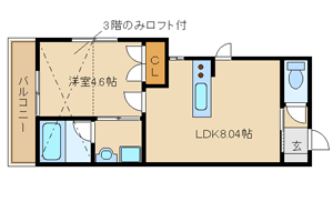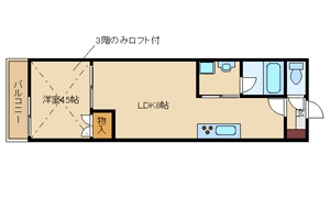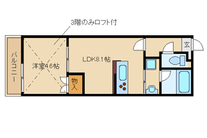 ワンルームでは手狭な方にもオススメの丁度いい広さです。3Fはロフト付きです。 |